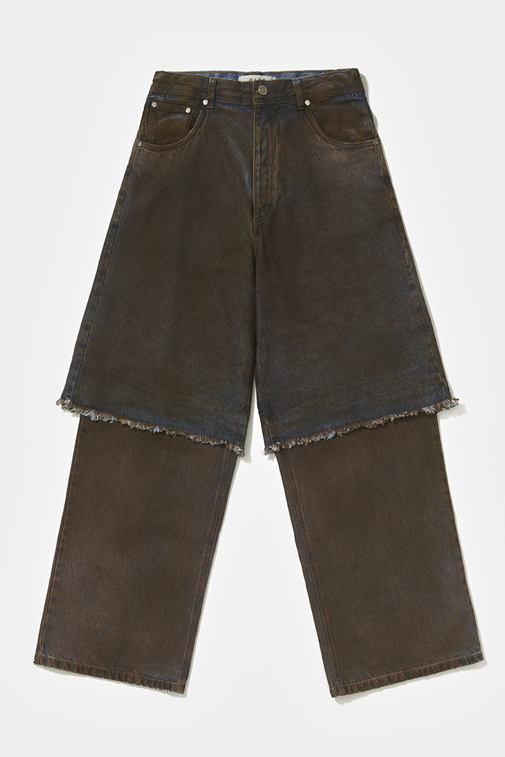 A Overlayed Denim Trousers apresenta uma silhueta ousada que brinca com proporções e sobreposições, trazendo uma bermuda oversized costurada sobre a base da calça. Confeccionada em denim 100% algodão 11oz, a peça possui corte solto, lavagens que simulam terra e acabamento vintage com puídos nos bolsos e barras. Detalhes como rebites e etiquetas personalizados reforçam a identidade da PIET, entregando um visual único, inspirado na estética bruta e funcional da coleção Farmers League.