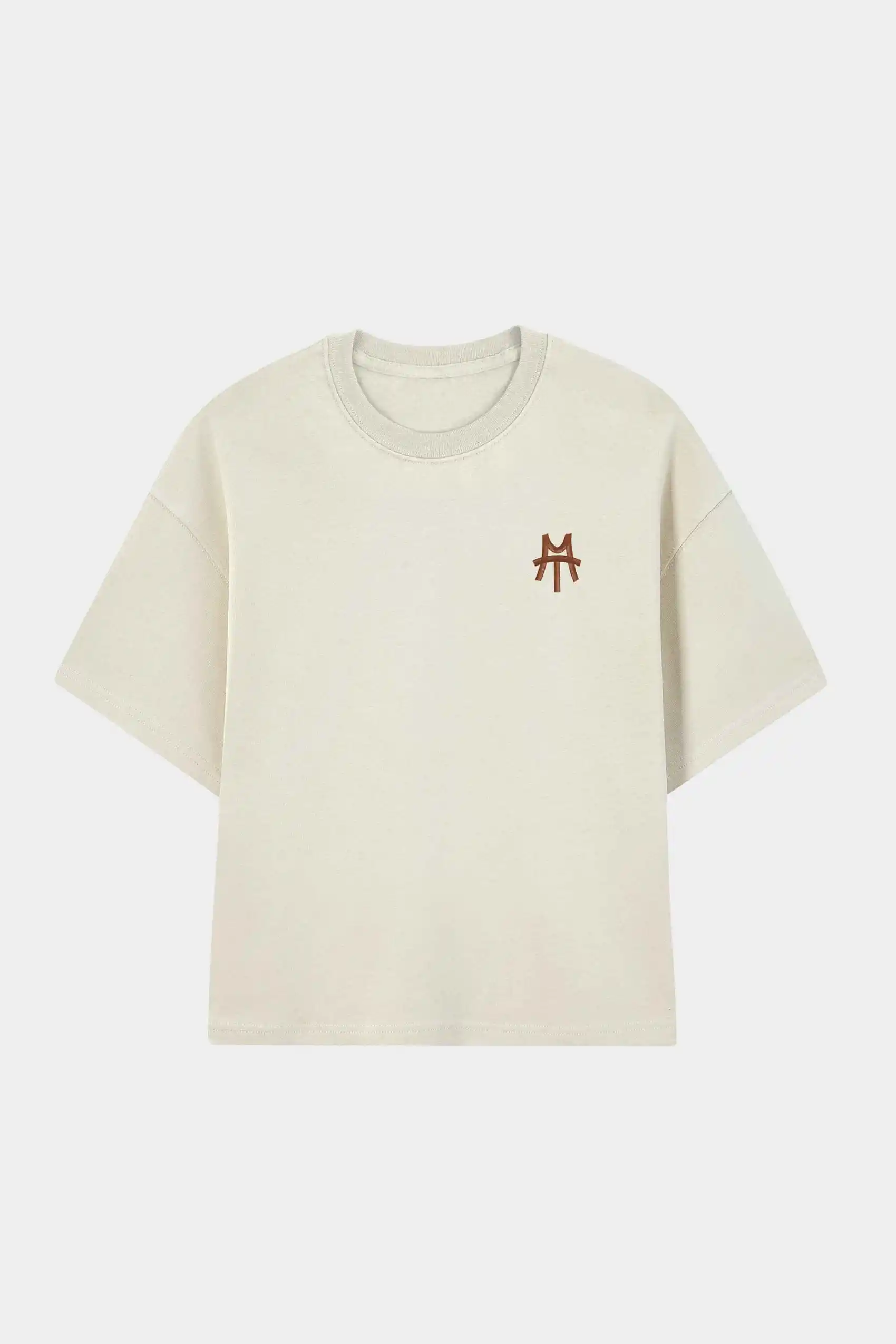 A estampa frontal minimalista com o logo MT no peito contrasta com a arte nas costas, que apresenta uma composição gráfica com diversos bonés da marca, reforçando identidade e repertório visual da Midas Touch.