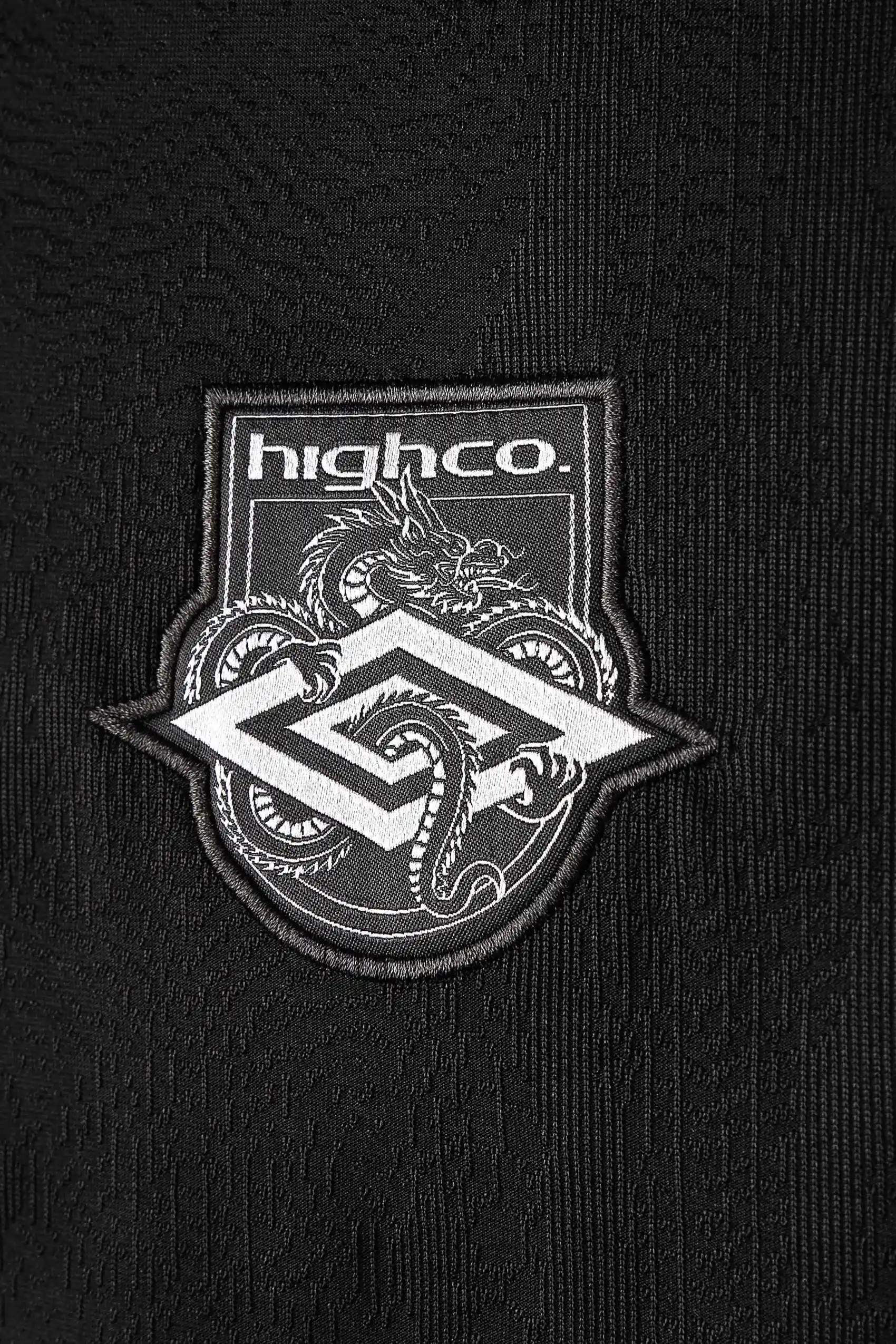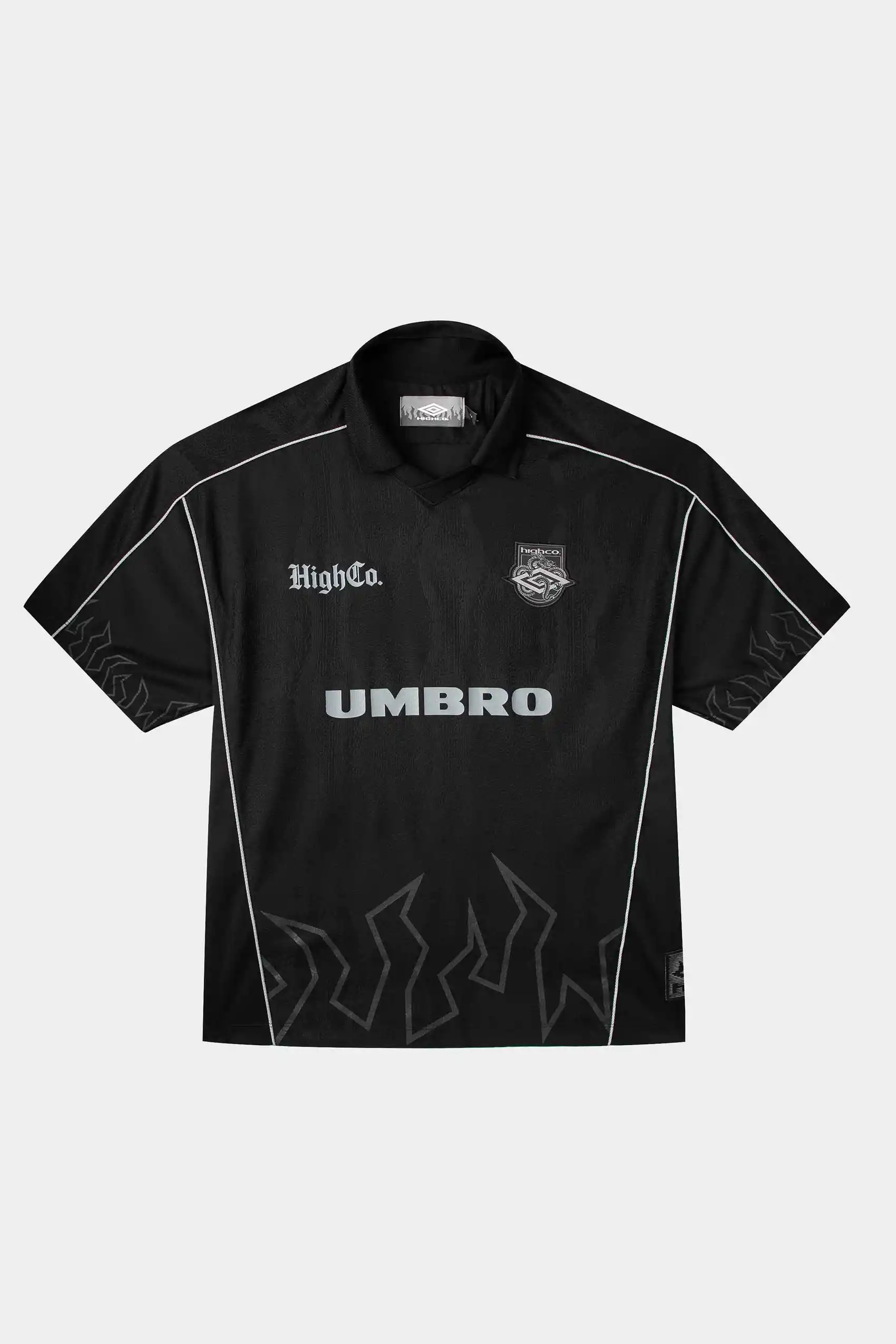 O destaque fica para a composição de símbolos: logo HIGH e escudo aplicado no peito, logo Umbro em grande escala na parte frontal, além das estampas de chamas nas mangas e extremidades, elemento característico da identidade da HIGH.