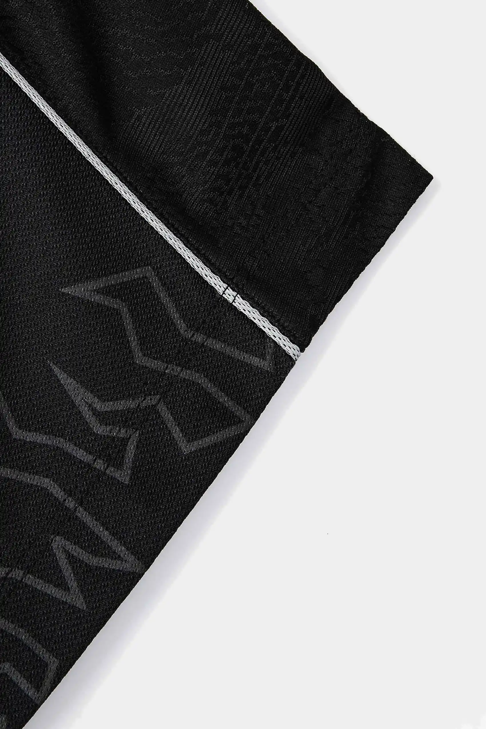 Confeccionada em jacquard texturizado, a peça apresenta uma construção rica em detalhes, com acabamentos em surton que reforçam a sofisticação do design. A base preta é contrastada por elementos em branco e cinza, criando profundidade visual e uma leitura gráfica marcante.